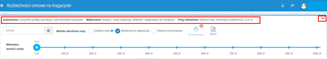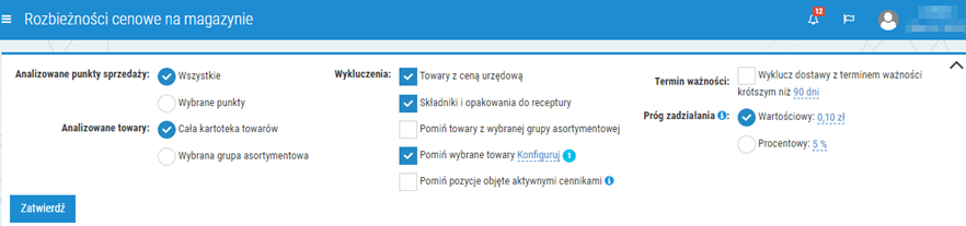 Rys. 1. Raport „Rozbieżności cenowe na magazynie”, dostępne filtry