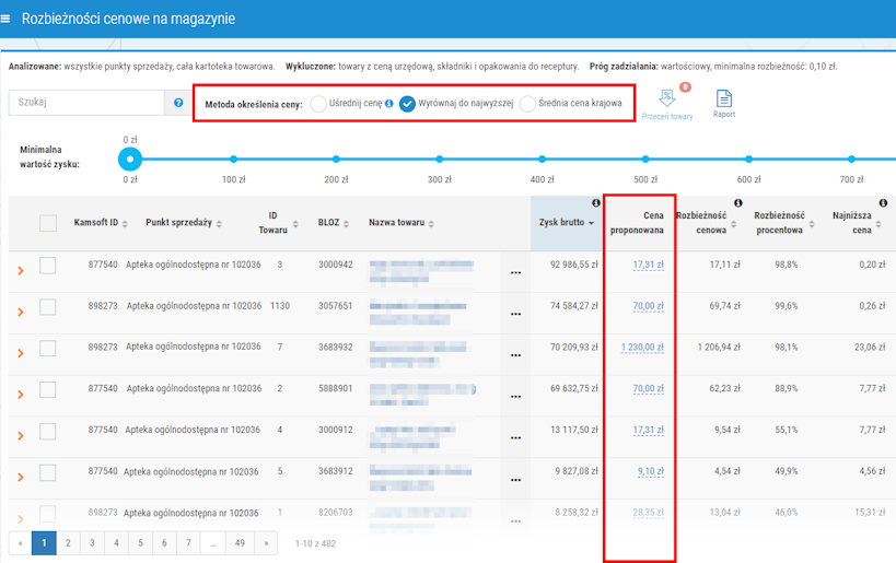Rys. 9. Wybrany algorytm (pole „Metoda określenia ceny”) skutkuje automatycznym wyliczeniem ceny proponowanej (kolumna „Cena proponowana”)
