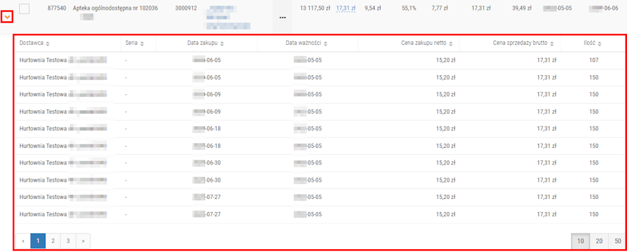 Domyślnie jako pierwsze na liście towarów wyświetlane są pozycje, które potencjalnie mogą przynieść najwyższy zysk użytkownikowi (jeżeli zastosowana zostanie przecena na wszystkie dostawy danego towaru zgodnie z proponowaną ceną (wartość w kolumnie Cena proponowana)). Każdy towar na liście można rozwinąć do poziomu szczegółów (klikając w ikonę