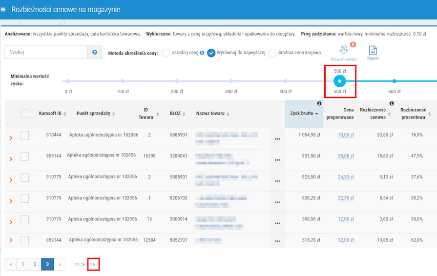 W górnej części okna znajduje się interaktywny suwak (pole Minimalna wartość zysku), za pomocą którego można określić pożądany minimalny zysk jaki użytkownik chce osiągnąć w wyniku zastosowania ewentualnej przeceny towarów. Zmiana ustawień suwaka automatycznie aktualizuje listę towarów w raporcie – wyświetlane są pozycje spełniające założone kryteria. Przykładowo: po ustawieniu suwaka na wartości 500 zł lista towarów została automatycznie zawężona do pozycji spełniających kryteria (liczba odfiltrowanych towarów jest widoczna w dolnej części okna, rys. poniżej).