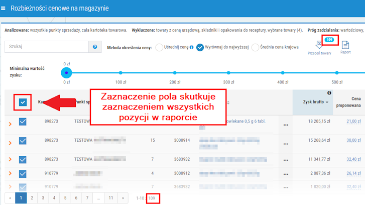 Rys. 14. Pole umożliwiające zaznaczenie wszystkich pozycji w raporcie, liczba zaznaczonych towarów jest widoczna w dolnej części okna oraz obok przycisku „Przeceń towary”
