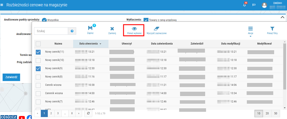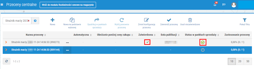 Rys. 3. System automatycznie zaznaczył cenniki z aktywnych strategii cenowych