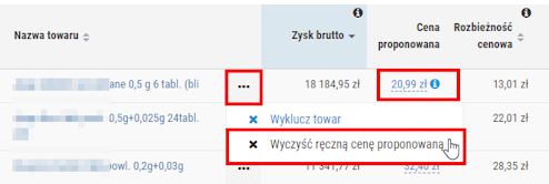 Jeżeli użytkownik po ręcznym wprowadzeniu ceny zmieni zdanie i zechce powrócić do ceny wyliczonej przez aktualnie ustawiony algorytm, to wówczas należy skorzystać z menu podręcznego przy towarze i wybrać opcję Wyczyść ręczną cenę proponowaną: