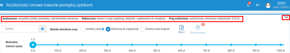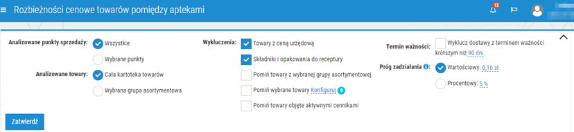 - Analizowane punkty sprzedaży – możliwość wskazania wszystkich aptek (ustawienie domyślne) lub tylko wybranych.