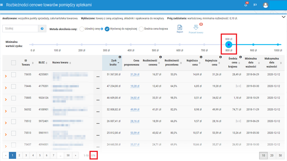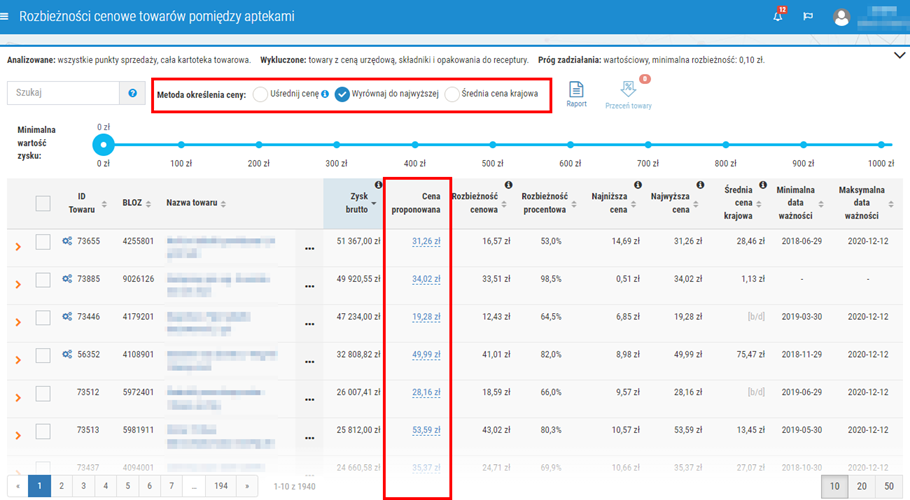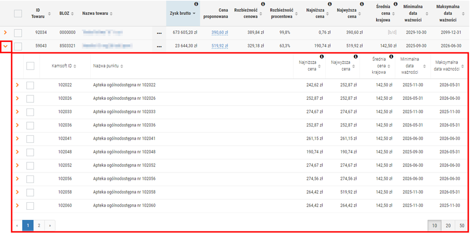 Domyślnie jako pierwsze na liście towarów wyświetlane są pozycje, które mogą przynieść potencjalnie najwyższy zysk (kolumna Zysk brutto) w przypadku zastosowania przeceny na wszystkie dostawy danego towaru zgodnie z proponowaną ceną (wartość w kolumnie Cena proponowana). Każdy towar na liście można rozwinąć do poziomu aptek klikając w ikonę