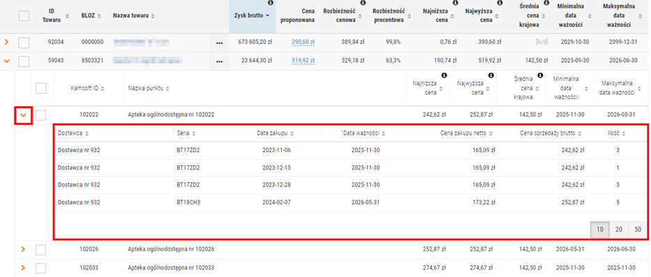 Dla każdej apteki można rozwinąć listę dostaw danego towaru, klikając w ikonę