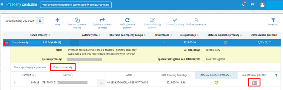 13. W szczegółach przeceny (zakładka Punkty sprzedaży) można sprawdzić czy została zastosowana w aptekach: