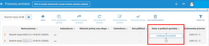 7. Następnie użytkownik zostanie przeniesiony do modułu Przeceny centralne, gdzie widoczne będą utworzone przeceny ze statusem
