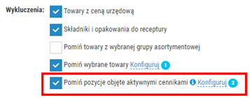 - Pomiń pozycje objęte aktywnymi cennikami – po zaznaczeniu opcji towary znajdujące się w cennikach włączonych do aktywnych strategiach cenowych nie zostaną uwzględnione w raporcie. System automatycznie zaznaczy cenniki wykorzystywane w aktywnych strategiach cenowych z wyłączeniem strategii, dla których zdefiniowano jeden z wymienionych warunków: termin ważności, data zakupu z podanego okresu, czas zalegania, określony dostawca, stały pacjent, kategoria pacjentów, określony prefiks numerów kart, data ważności. Wykluczenie obejmuje towar we wszystkich aptekach. Obok pola Konfiguruj widoczna będzie liczba cenników wskazanych do wykluczenia. Przykładowo na rysunku poniżej widać, że do wykluczenia wskazano towary z dwóch cenników: