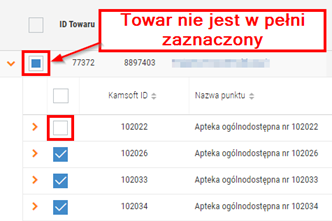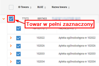 - Wspólna przecena dla wybranych towarów oraz punktów sprzedaży – utworzona zostanie jedna przecena zawierająca wszystkie w pełni wybrane towary oraz apteki na podstawie aktualnie ustawionych filtrów dla punktów sprzedaży. Towar w pełny wybrany to taki, który na liście raportu jest zaznaczony tak jak na rysunku nr 18, czyli zaznaczony jest towar oraz wszystkie apteki widoczne po rozwinięciu: