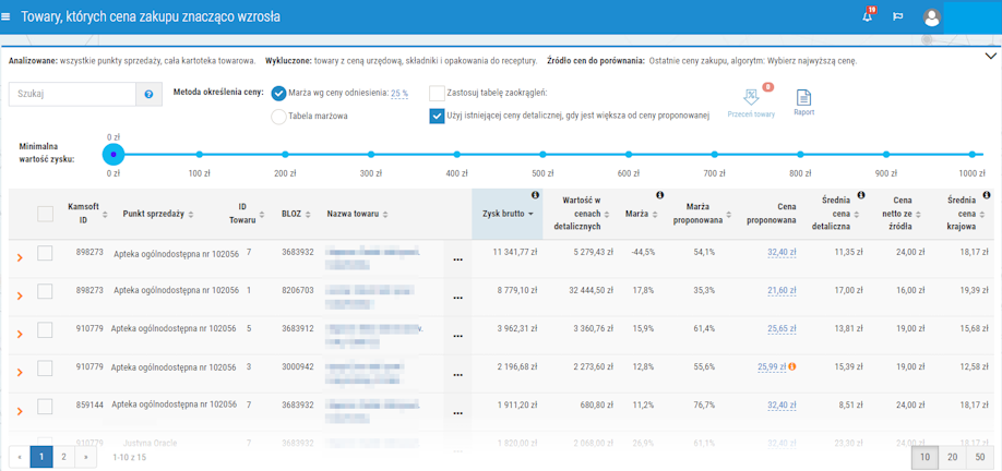 Domyślnie jako pierwsze na liście wyświetlane są produkty, które potencjalnie mogą przynieść użytkownikowi najwyższy zysk brutto (jeżeli zastosowana zostanie przecena na wszystkie dostawy danego towaru zgodnie z proponowaną ceną (wartość w kolumnie Cena proponowana)). Dla każdej pozycji na liście można wyświetlić szczegóły (klikając w ikonę