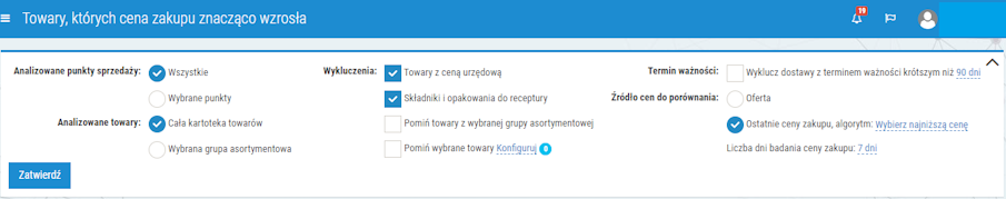 Raport jest aktualnie udostępniony w celach demonstracyjnych i znajduje się w module Polityka cenowa > Strażnik marży > Towary ze znaczącym wzrostem ceny zakupu (w przyszłości może wchodzić w skład oddzielnej usługi). Przed wygenerowaniem danych należy zdefiniować kryteria, które zostaną uwzględnione podczas analizy (rys. poniżej). Po ustawieniu filtrów wystarczy wybrać Zatwierdź.