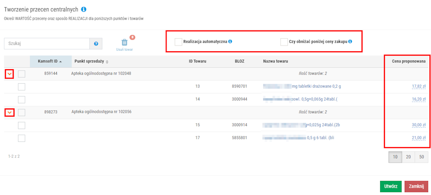 4. W kolejno wyświetlonym oknie należy zweryfikować wprowadzoną kwotę przeceny dla danego towaru (kolumna Cena proponowana) i sposób realizacji (czy przecena ma zostać wprowadzona w sposób bezobsługowy we wskazanych aptekach (pole Realizacja automatyczna) czy też decyzja o zatwierdzeniu ma należeć do farmaceuty Czy obniżać poniżej ceny zakupu). Lista wskazanych towarów jest wyświetlona w podziale na apteki, aby wyświetlić szczegóły (listę przecenianych towarów), należy kliknąć w ikonę