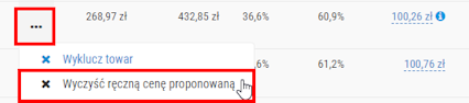 Jeżeli użytkownik po ręcznym wprowadzeniu ceny zmieni zdanie i zechce powrócić do ceny wyliczonej przez aktualnie ustawiony algorytm, to wówczas należy skorzystać z menu podręcznego przy towarze > Wyczyść ręczną cenę proponowaną: