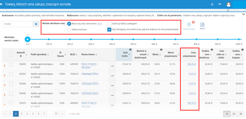 Rys. 6. Wybrany algorytm (pole „Metoda określenia ceny”) skutkuje automatycznym wyliczeniem ceny proponowanej (kolumna „Cena proponowana”)