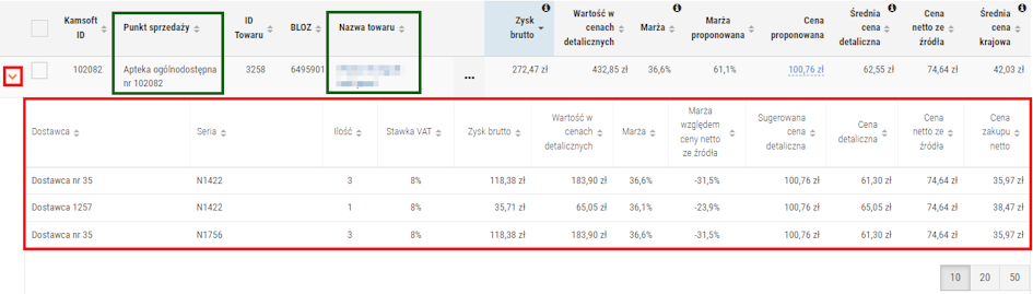 Rys. 5. Lista dostaw danego towaru, który znajduje się aktualnie na stanie (w konkretnej aptece)