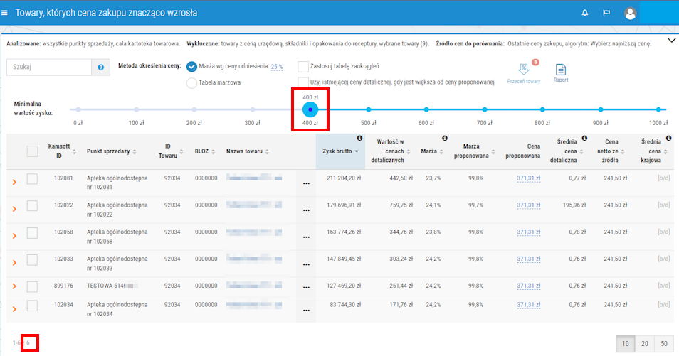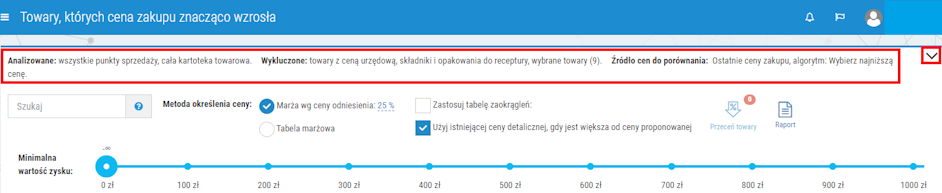- można dodatkowo skorzystać z interaktywnego suwaka w celu zawężenia listy towarów do pozycji, które mogą przynieść określony zysk po zastosowaniu przeceny (rys. 9),