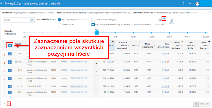Rys. 12. Pole umożliwiające zaznaczenie wszystkich pozycji w raporcie, liczba zaznaczonych towarów jest widoczna w dolnej części okna oraz obok przycisku „Przeceń towary”
