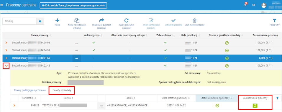 10. W szczegółach przeceny (zakładka Punkty sprzedaży) można sprawdzić czy została zastosowana w aptekach:
