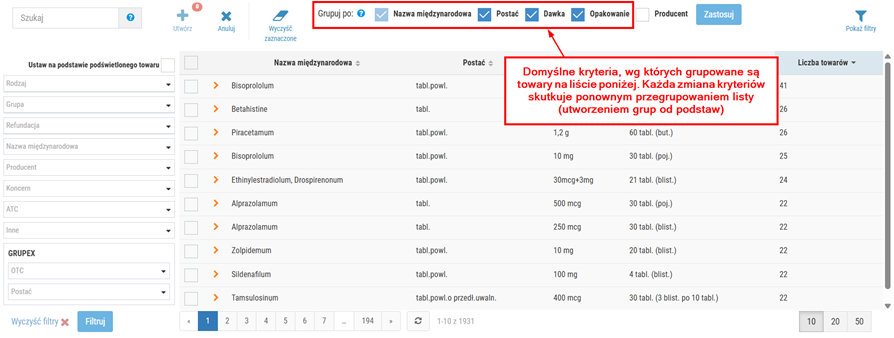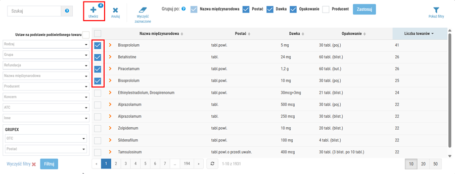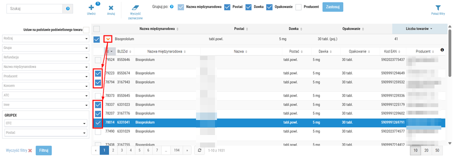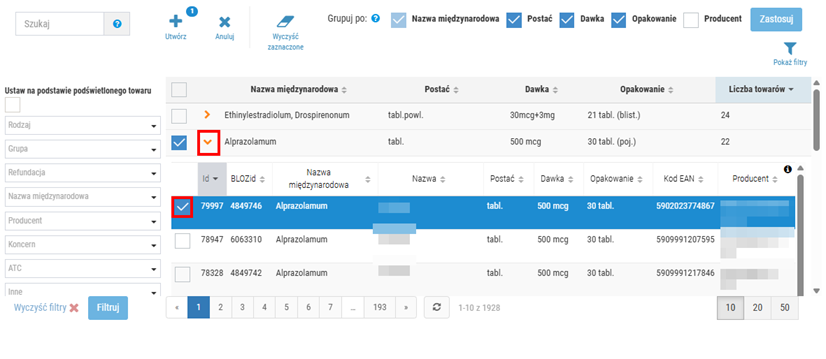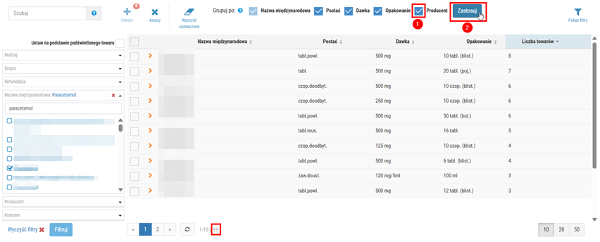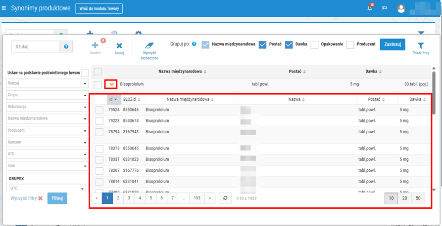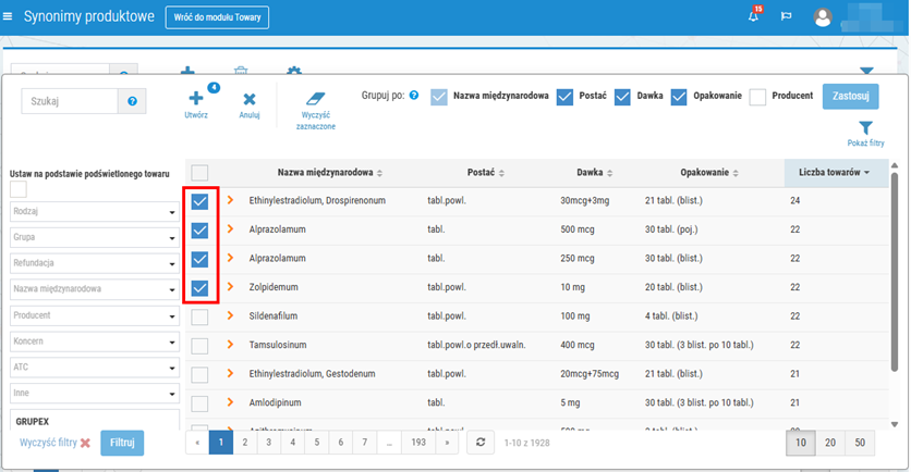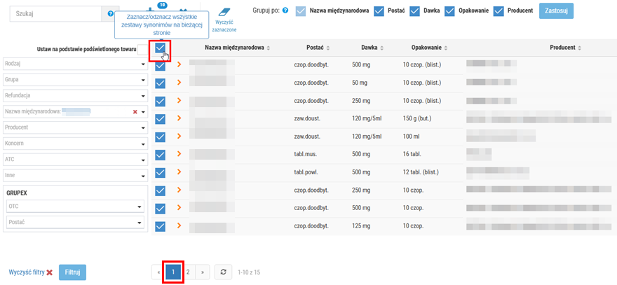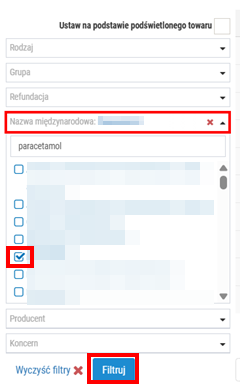 Podczas definiowania nowego zestawu synonimów użytkownik może zawęzić listę wyświetlanych wyników tylko do wybranych pozycji np. o konkretnej nazwie międzynarodowej. W tym celu należy skorzystać z selektora widocznego po lewej stronie okna. Po ustawieniu kryteriów w selektorze, należy kliknąć Filtruj, a następnie lista prezentowanych wyników zostanie automatycznie odświeżona, np.: