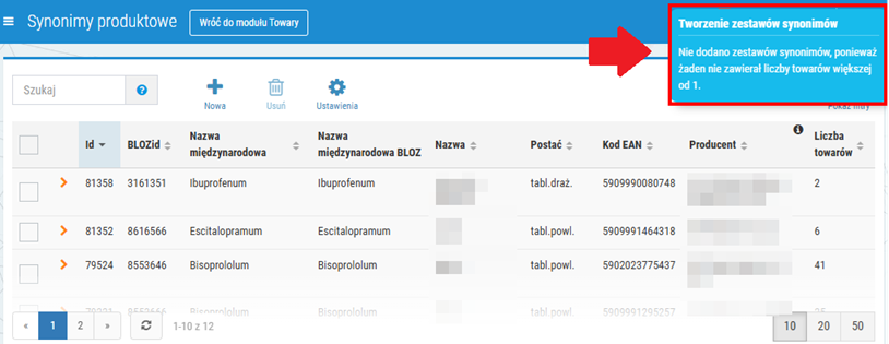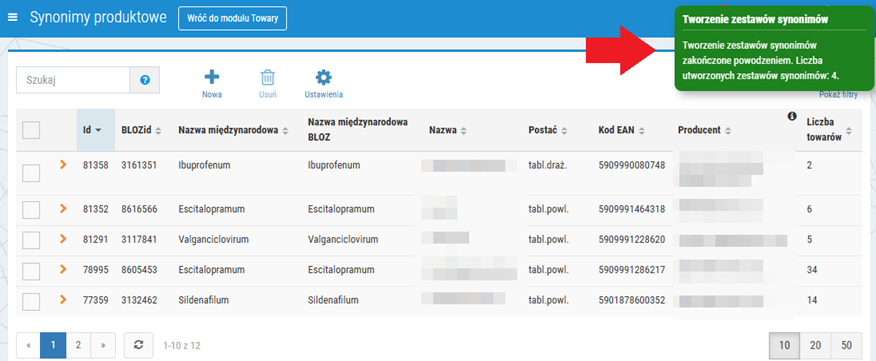 5. Zestawy synonimów zostaną utworzone. Nowe pozycje pojawią się na głównej liście w oknie Synonimy produktowe i w prawym górnym rogu okna wyświetlony zostanie odpowiedni komunikat, np.: