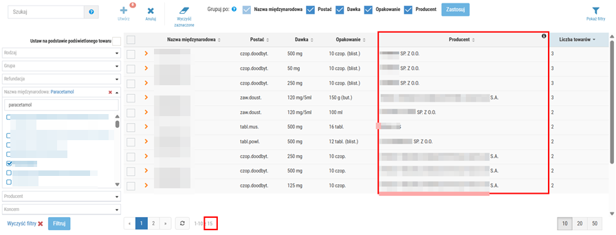 Po wykonaniu akcji lista wyników zostanie odświeżona z uwzględnieniem nowego kryterium. Na liście pojawi się także dodatkowa kolumna Producent:
