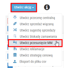 4. Po zaznaczeniu pożądanych towarów, należy wybrać kolejno Utwórz akcję > Utwórz przesunięcie MM:
