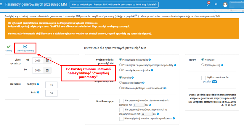 Jeżeli dla wybranych parametrów utworzenie przesunięć MM nie będzie możliwe, to w górnej części okna wyświetlony zostanie komunikat na pomarańczowym tle. Zawarta w nim będzie podpowiedź co użytkownik może zrobić, np. zwiększyć dopuszczalny poziom zapasu w dniach (opcja Braki), rys. poniżej. Po zmianie opcji należy pamiętać o kliknięciu w przycisk Zweryfikuj parametry, wówczas system przeliczy czy wykonanie przesunięć będzie możliwe po zmianie ustawień. Jeżeli zmiana parametrów nie przyniesie oczekiwanych rezultatów, warto rozważyć wykonanie innej akcji biznesowej z udziałem wybranych towarów.