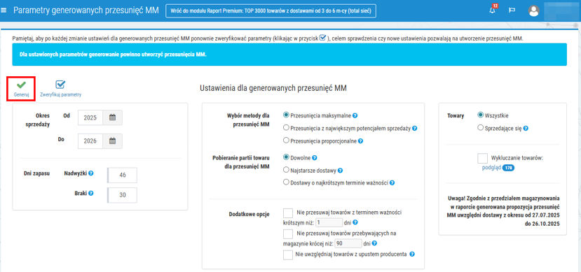 8. Po skonfigurowaniu parametrów, należy wybrać przycisk Generuj (system rozpocznie proces przygotowywania propozycji przesunięć MM):
