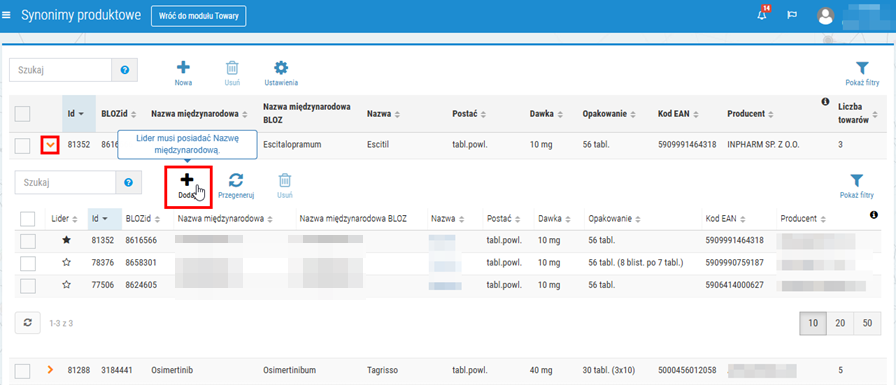 2. Po wybraniu opcji wyświetlona zostanie lista towarów z tą samą nazwą międzynarodową co lider danego zestawu synonimów.