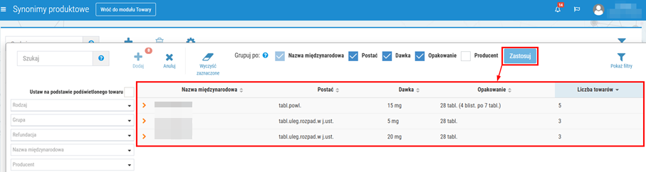 3. Tak przygotowaną listę towarów można dodatkowo pogrupować za pomocą kryteriów w górnej części okna: w tym celu należy zaznaczyć wybrane kryteria w polu Grupuj po, a następnie kliknąć Zastosuj. Uwaga! Po każdej zmianie kryteriów grupowania należy kliknąć Zastosuj, aby odświeżyć wyniki (może zdarzyć się sytuacja, że nie wszystkie towary grupie synonimicznej uda się przeliczyć w stosunku do lidera grupy).