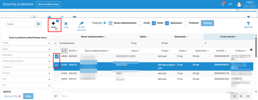 4. W ten sposób wyselekcjonowane i pogrupowane listy synonimów można rozwinąć do poziomu szczegółów i zaznaczyć wybrane towary, które następnie można dodać do zestawu synonimów za pomocą przycisku Dodaj: