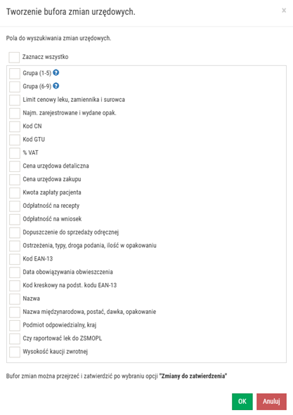 Pozostałe pola można zaznaczyć w zależności od decyzji osoby zarządzającej. Są to: VAT%, Odpłatność na wniosek, Dopuszczenie do sprzedaży odręcznej, Kod kreskowy, Nazwa międzynarodowa, postać, dawka, opakowanie, Podmiot odpowiedzialny i kraj, Czy raportować do ZSMOPL, Wysokość kaucji zwrotnej. Po zaznaczeniu pól, należy kliknąć Ok. Zaznaczone pola zostaną zaktualizowanie na podstawie zmian urzędowych.