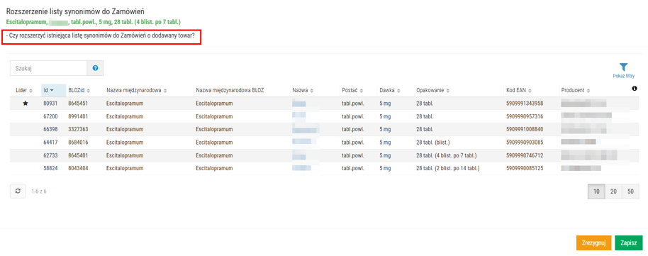 - Gdy zaznaczone są pola: nazwa międzynarodowa, dawka i postać, to weryfikacja odbywa się po grupie odpowiedników bez opakowania z BLOZ.