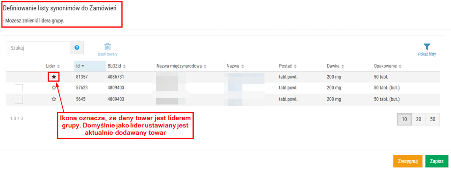 przy wybranej pozycji). Propozycję utworzenia grupy użytkownik może zaakceptować lub odrzucić za pomocą przycisków w dolnej części okna. Aby potwierdzić utworzenie zestawu synonimów, należy wybrać Zapisz, natomiast aby zrezygnować, należy kliknąć Zrezygnuj.