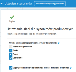 - Zapisz – dodanie towaru do zestawu synonimów.