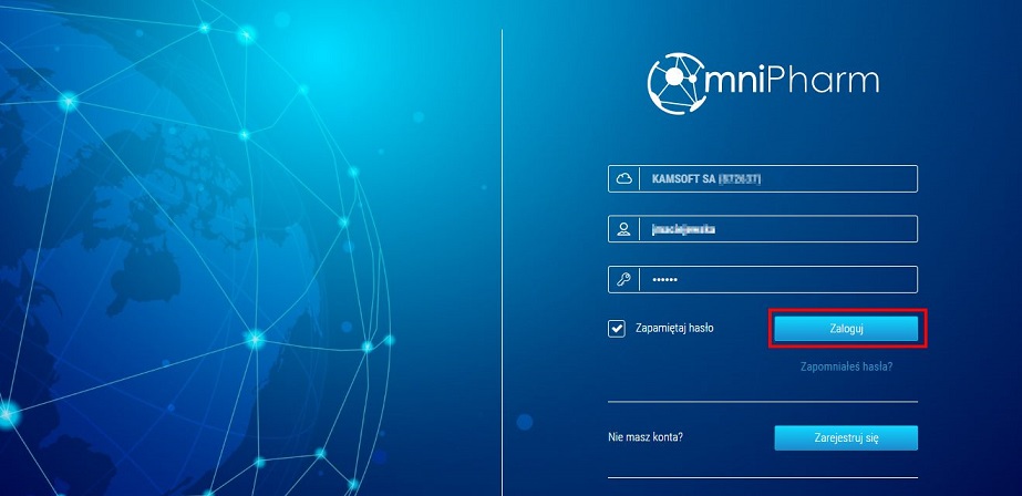 Po pomyślnej rejestracji (Rejestracja) oraz wczytaniu certyfikatu (Import certyfikatu) wystarczy się zalogować, aby rozpocząć pracę z systemem KS-OmniPhram.