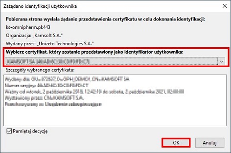 Rys. 7. Konieczność wskazania właściwego certyfikatu podczas próby zalogowania do systemu KS-OmniPharm z poziomu przeglądarki Mozilla Firefox