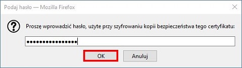 4. Następnie należy wpisać hasło certyfikatu otrzymane w e-mailu i kliknąć Ok: