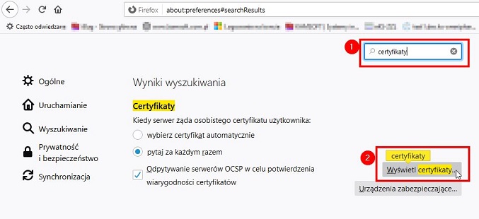 Import certyfikatu, przeglądarka Mozilla Firefox
