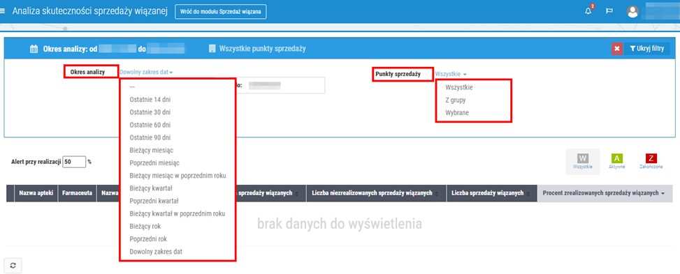 Na przykładowym raporcie widoczna jest lista sprzedaży wiązanych z wybranego okresu analizy wraz z informacją o liczbie zrealizowanych i niezrealizowanych strategii. Z tego poziomu można sprawdzić szczegóły każdej akcji (listę produktów). Realizacje poniżej określonego progu będą podświetlane kolorem czerwonym. Próg można ustawić w polu Alert przy realizacji ... % sugestii. Każdy raport można filtrować według wybranego okresu analizy (domyślnie jest to bieżący rok) oraz wybranych punktów sprzedaży, filtry są widoczne po wybraniu Pokaż filtry:
