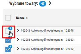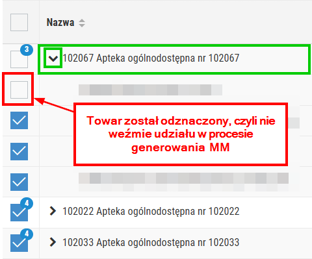 Aby wykluczyć z procesu generowania przesunięć część towarów z danej apteki, należy rozwinąć ją do poziomu szczegółów i odznaczyć pola wyboru przy produktach, które mają zostać wykluczone. Po odznaczeniu min. jednego towaru z listy, pole wyboru przy nazwie punktu sprzedaży również zostanie odznaczone, jednak będzie uwzględnione podczas generowania przesunięcia (z wyjątkiem odznaczonych towarów). Przykładowo: