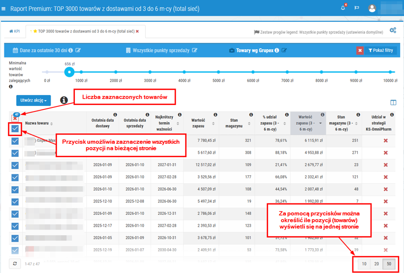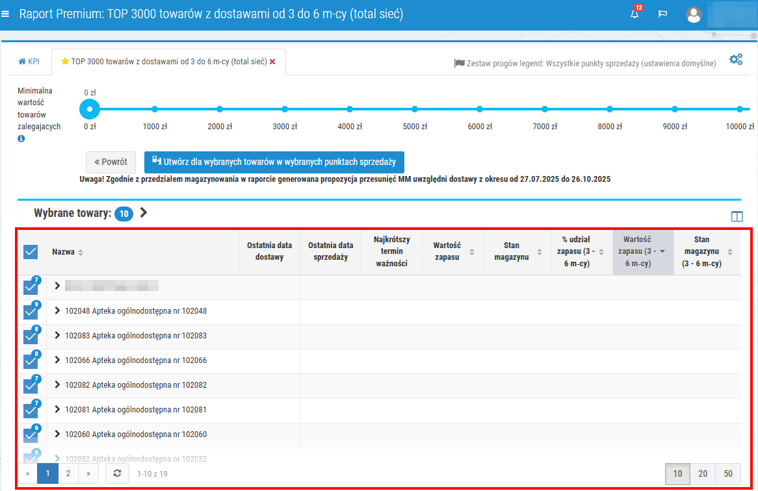 Poniżej zaprezentowany został przykład utworzenia propozycji przesunięcia międzymagazynowego z poziomu raportu Top 3000 towarów z dostawami od 3 do 6 miesięcy (total sieć) który prezentuje listę towarów z dostawami od 3 do 6 miesięcy w skali całej sieci (dane aktualne na ostatni dzień wybranego okresu analizy). W przypadku takiej listy produktów można rozważyć wykonanie przesunięcia międzymagazynowego, ponieważ być może w sieci istnieją apteki, które wykazują zapotrzebowanie na dany towar. Akcję można wykonać bezpośrednio z poziomu KPI PREMIUM.