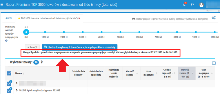 UWAGA! Przesunięcia MM wygenerowane z tego poziomu będą obejmować wskazane towary, ale wyłącznie z dostaw z przedziału magazynowania od 3 do 6 miesięcy (zgodnie z założeniami raportu). Dokładny zakres dat będzie widoczny nad listą aptek, np.: