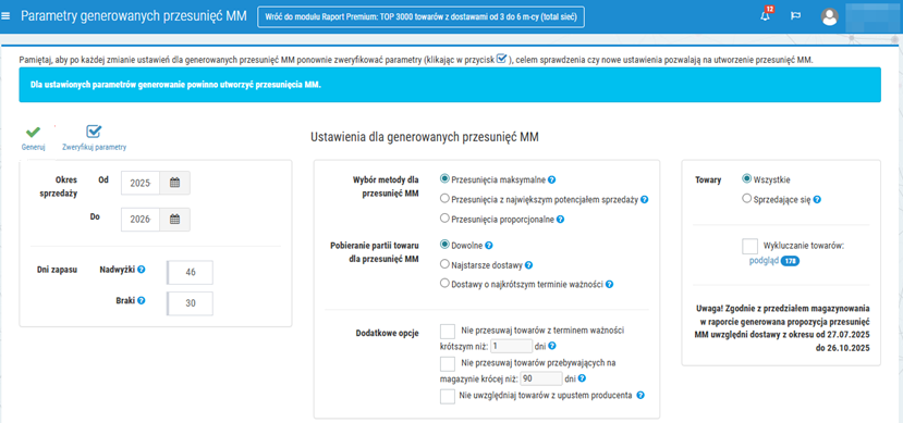 UWAGA! Przesunięcia MM wygenerowane z poziomu raportu KPI PREMIUM TOP 3000 towarów z dostawami od 3 do 6 miesięcy będą obejmować wskazane towary, lecz uwzględnione zostaną dostawy wyłącznie z przedziału magazynowania od 3 do 6 miesięcy (zgodnie z założeniami raportu). Dokładny zakres dat będzie widoczny w oknie parametryzowania generowanych przesunięć MM, przykładowo: