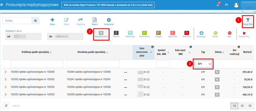 Rys. 20. Filtrowanie listy przesunięć (w celu wyświetlenia nieopublikowanych przesunięć utworzonych z poziomu KPI Premium)